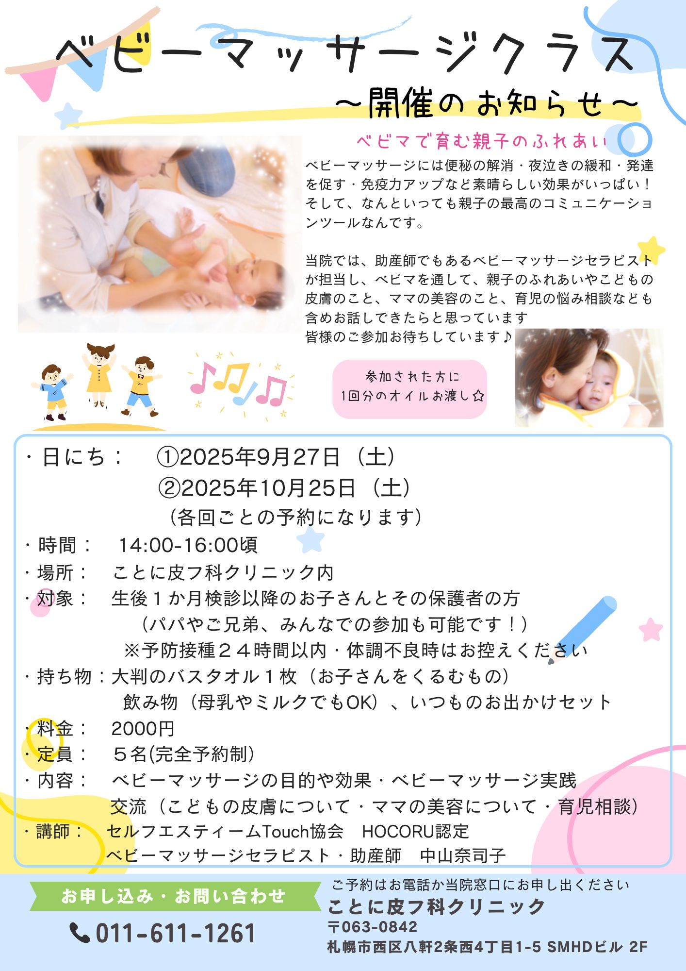 2025.09.18 お知らせ 第15回、第16回ベビーマッサージクラスのお知らせ こんにちは、ことに皮フ科クリニックです。 第15回、第16回ベビーマッサージクラスのご案内です。 ご興味のある方はぜひ、お問合せください。