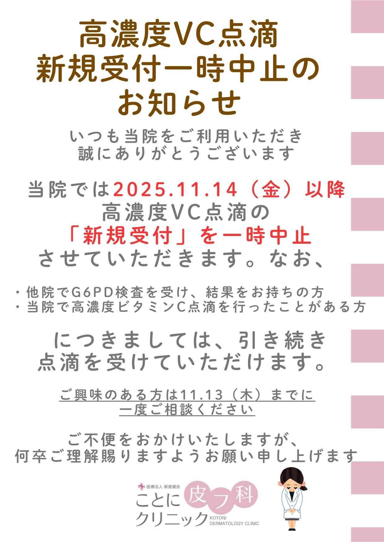 2025.10.17 お知らせ 高濃度VC点滴 新規受付一時中止のお知らせ こんにちは、ことに皮フ科クリニックです。 高濃度VC点滴新規受付一時中止のお知らせです。 これまでご興味をお持ちで、まだ高濃度VC点滴を行えていなかった方も、 ぜひこの機会に 11月13日(木)まで一度ご相談ください。