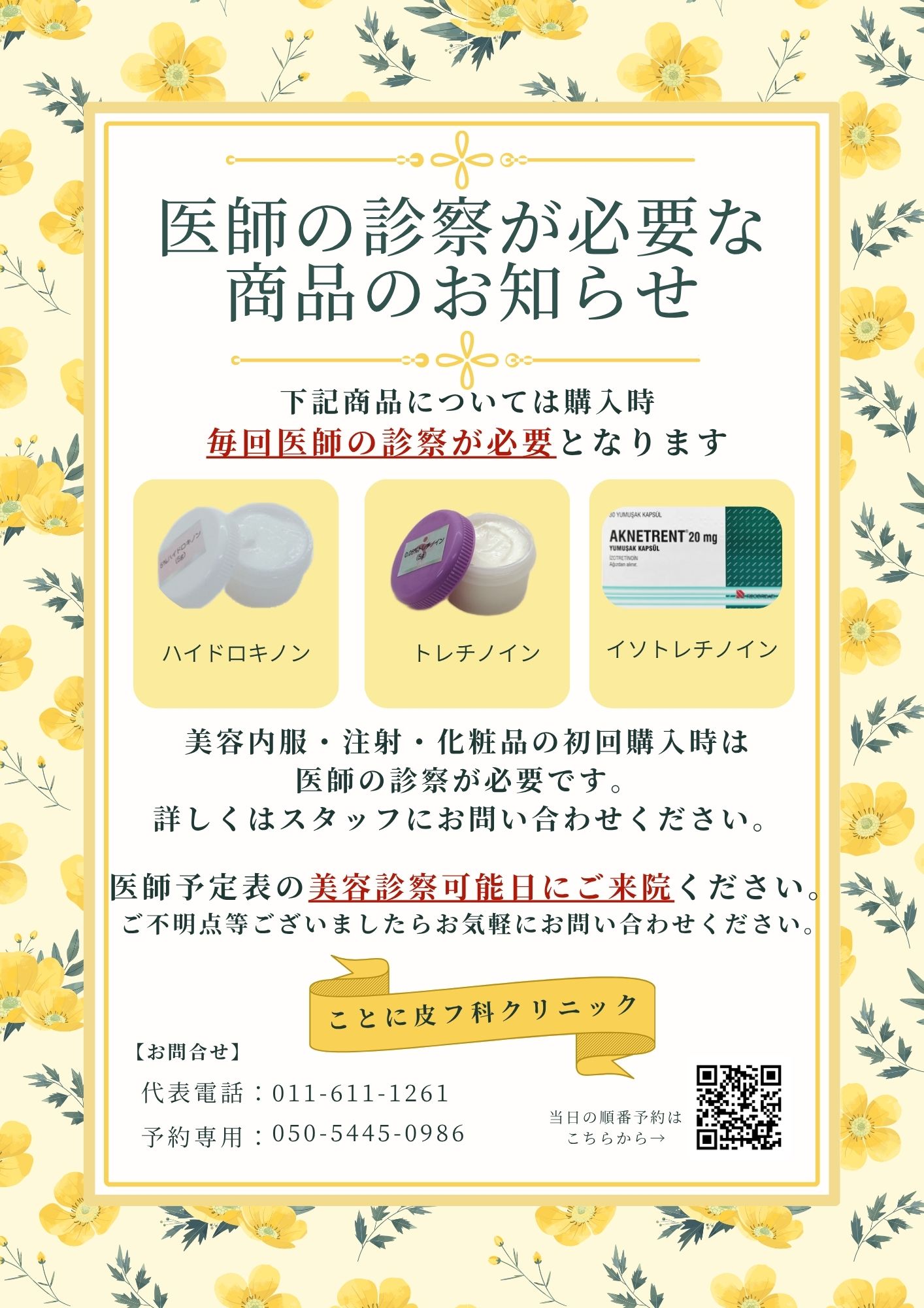 2025.10.29 お知らせ 医師の診察が必要な商品のお知らせ 日頃よりことに皮フ科クリニックにご来院いただきありがとうございます。 当院でお取り扱いのある商品「ハイドロキノン・トレチノイン・イソトレチノイン」を購入希望の方は毎回医師の診察が必要となりますので皆様にお知らせです。 購入を希望の方は平日、または医師予定表の美容診察可能日にご来院をください。 皆様にはご面倒をおかけいたしますが、安心してご購入していただくためのご案内となりますので、ご理解のほどよろしくお願いいたします。 ご不明な点がございましたらどうぞお気軽にお問い合わせください。