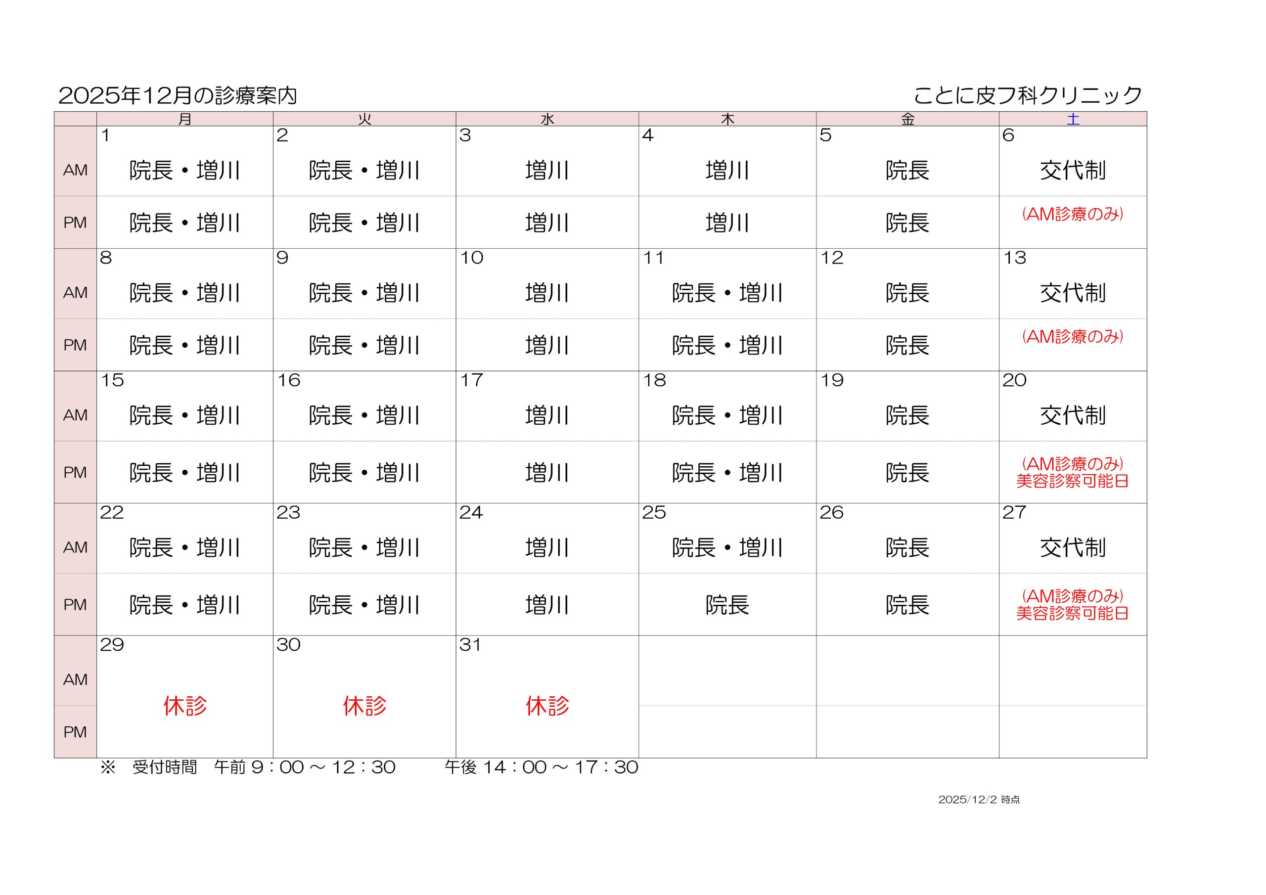 2025.12.02 診療時間 2025年12月診療案内※12/2更新 こんにちは、ことに皮フ科クリニックです。 2025年12月の診察担当医は下記の通りです。 診察をご希望の方はご自身の受付番号が来ていなくても診療受付時間までにご来院をお願いいたします。 医師一人の診察日は混み合うことが予想されます。予め、ご了承ください。 土曜診療日 6日,13日,20日,27日 12月の美容診察可能日 平日毎日と土曜日は20日,27日です。 医師不在日 院長不在日➢4日 増川医師不在日➢25日午後 休診日 29日,30日,31日 診察担当医
