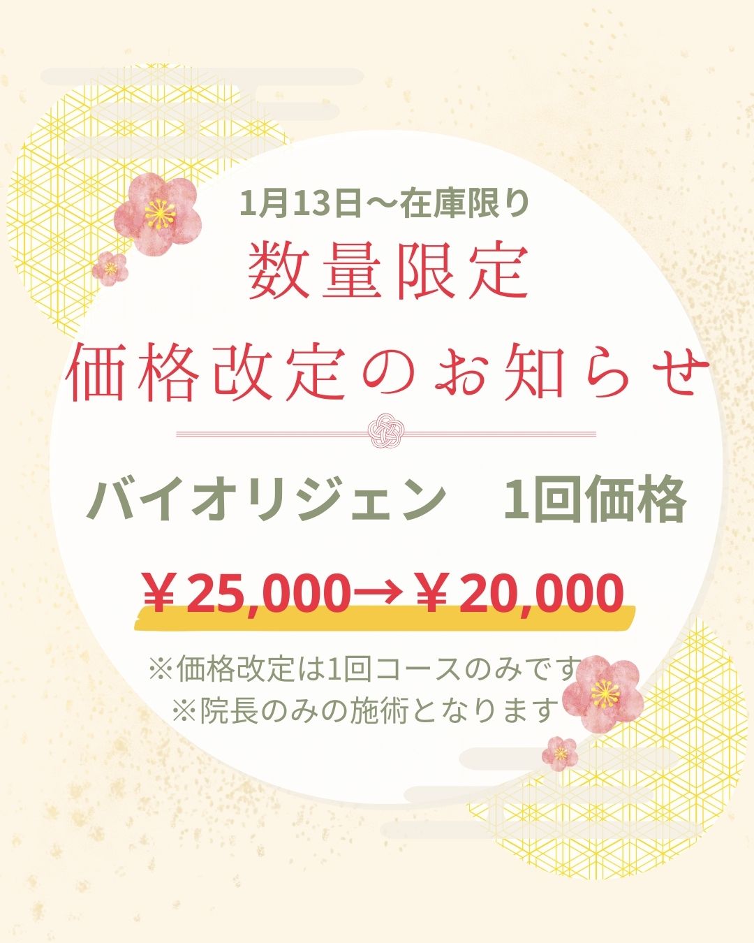 2026.01.06 お知らせ バイオリジェン価格改定のお知らせ(数量限定) こんにちは。ことに皮フ科クリニックです。 いつも当院をご利用いただき、誠にありがとうございます。 当院では、2026/1/13よりバイオリジェンの価格改定を実施いたします。 こちらは在庫がなくなり次第終了となります。 また、こちらは院長のみの施術となりますので院長のいる診療日に来院していただくようお願いいたします。詳しくは診療案内をご覧ください。