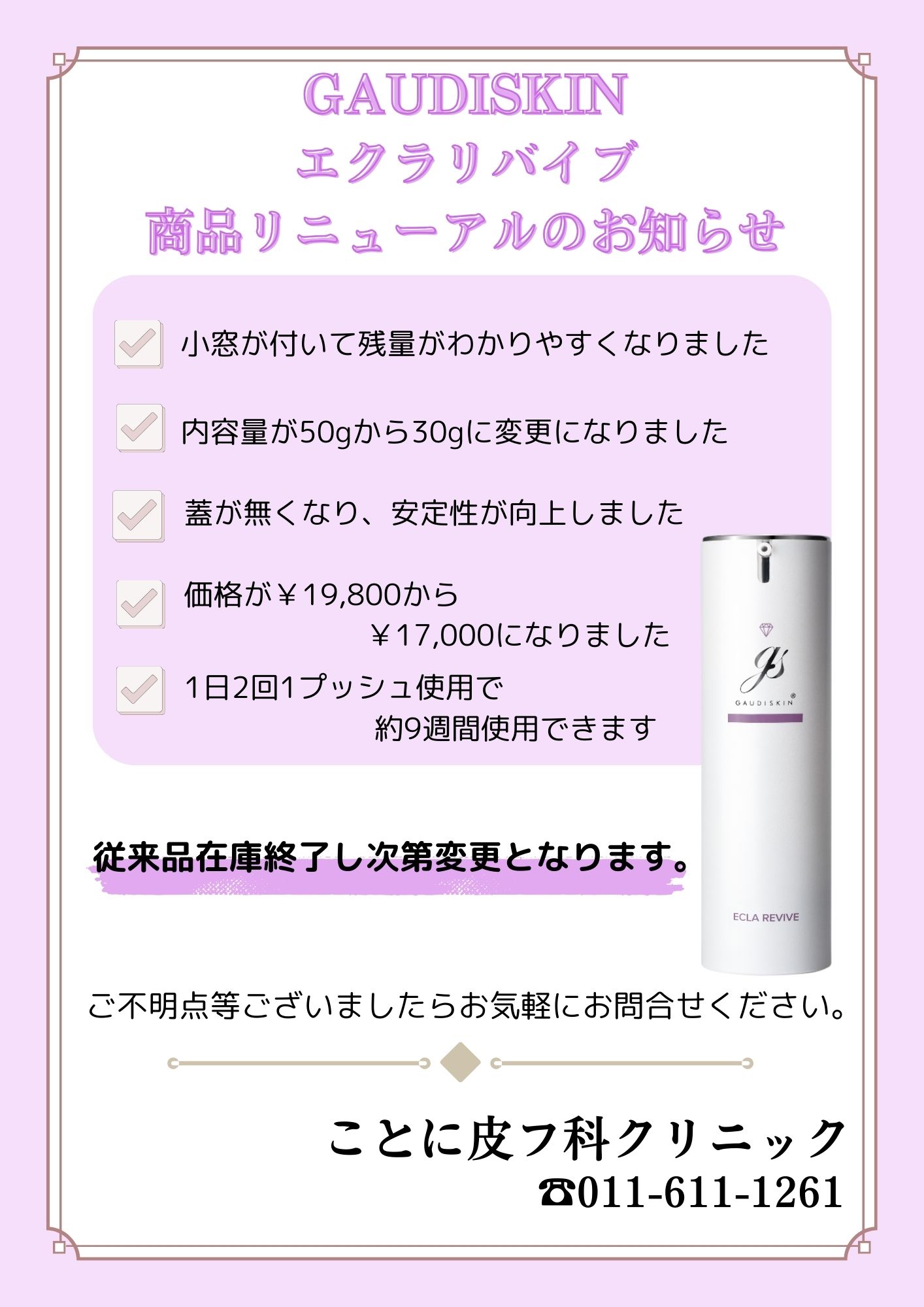 2026.02.10 お知らせ GAUDISKIN商品リニューアルのお知らせ こんにちは。ことに皮フ科クリニックです。 いつも当院をご利用いただき、誠にありがとうございます。 GAUDISKIN商品リニューアルのお知らせでございます。 他のGAUDISKIN商品も在庫終了次第、リニューアル品へ変更となります。