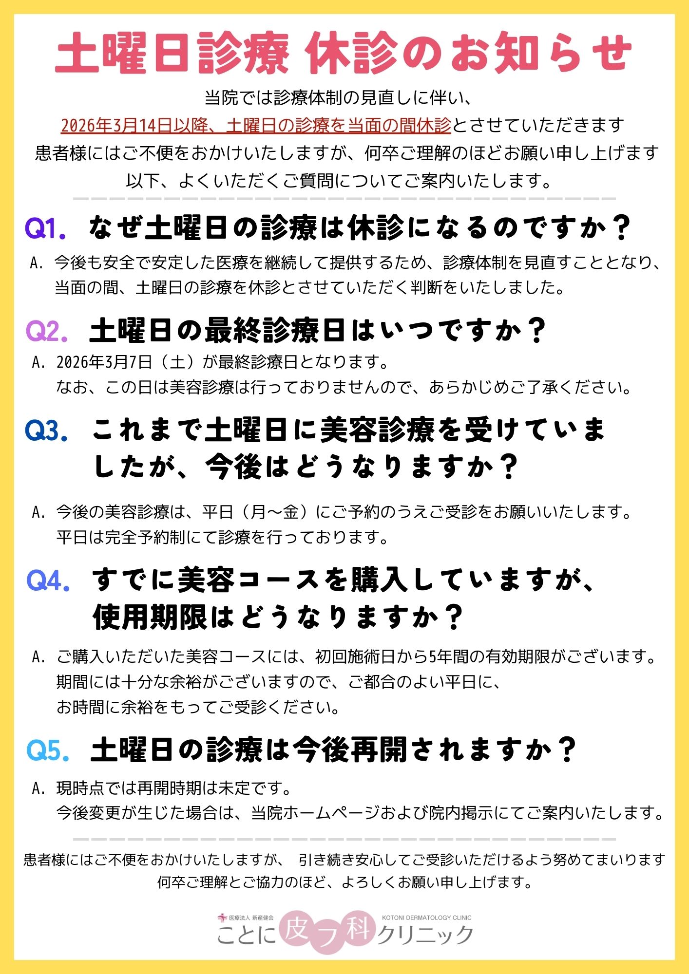 2026.02.26 お知らせ 土曜診療休診のお知らせ こんにちは ことに皮フ科クリニックでございます。 下記の通り、当面の間土曜日診療は休診となりますのでお知らせさせていただきます。 ★土曜最終診療日は2026年3月7日(土)9:00~13:00となっております。 ※この日は美容診察は行っておりませんので予めご了承ください