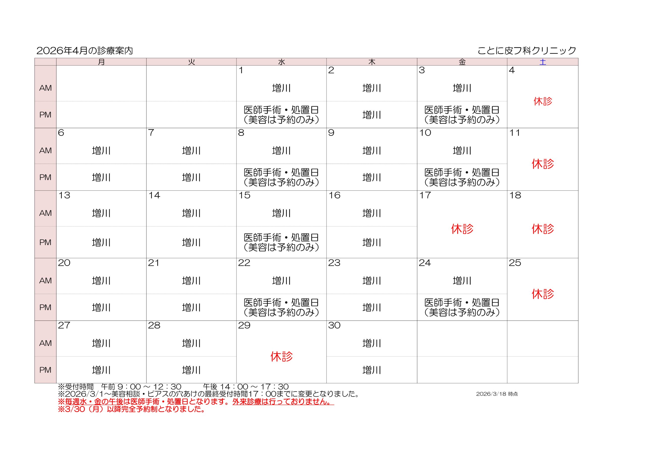 2026.03.18 診療時間 2026年4月診療案内※3/18更新 こんにちは、ことに皮フ科クリニックです。 2026年4月の診察担当医は下記の通りです。 2026/3/30(月)以降当院は完全予約制となります。詳細につきましては、後日お知らせさせていただきます。 医師手術・処置日 毎週水曜・金曜の午後は医師手術・処置日となります。 外来診療は受け付けておりませんのでご注意ください。 土曜診察日 土曜日は当面の間休診となります。 休診日 17日、29日 診察担当医