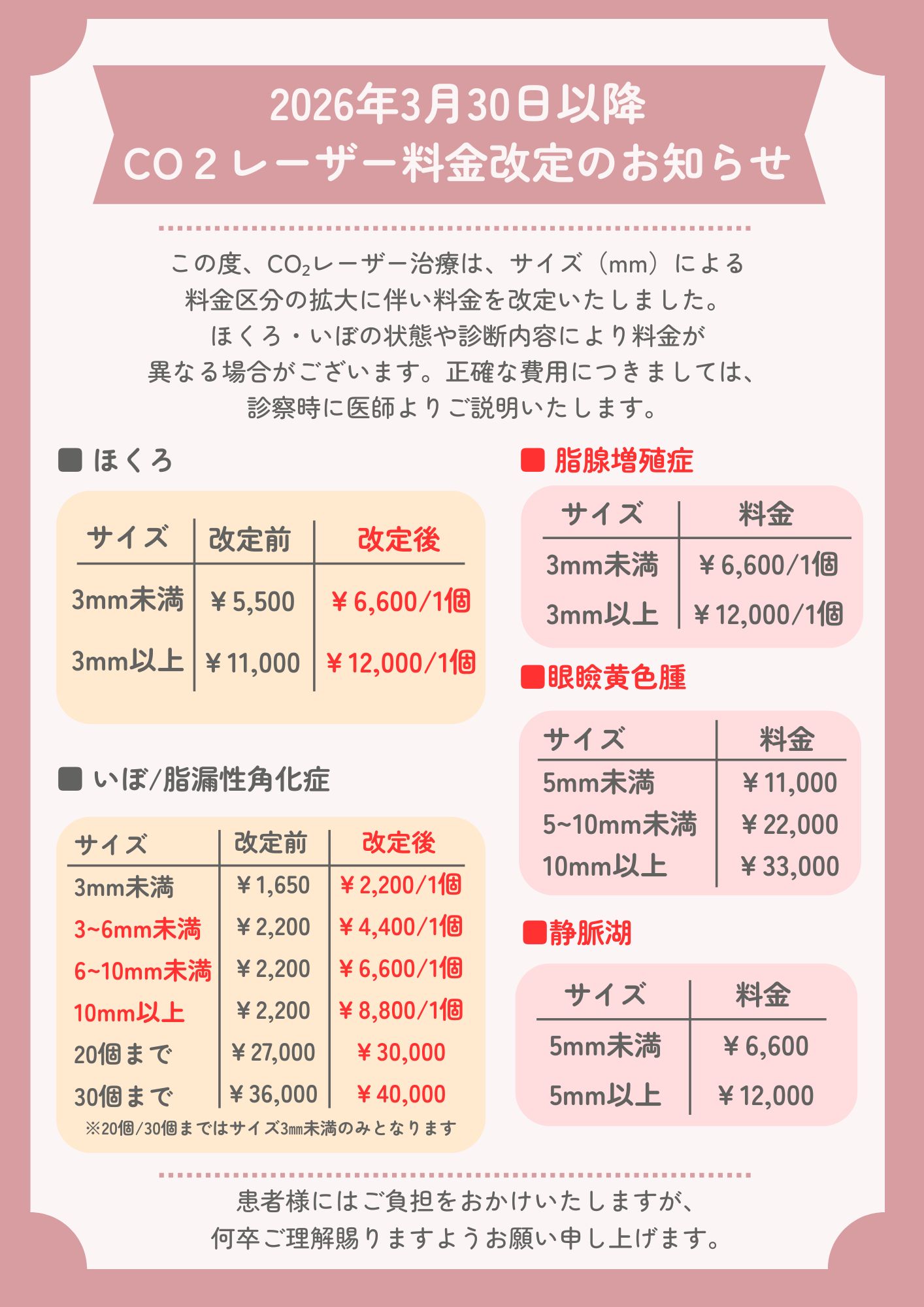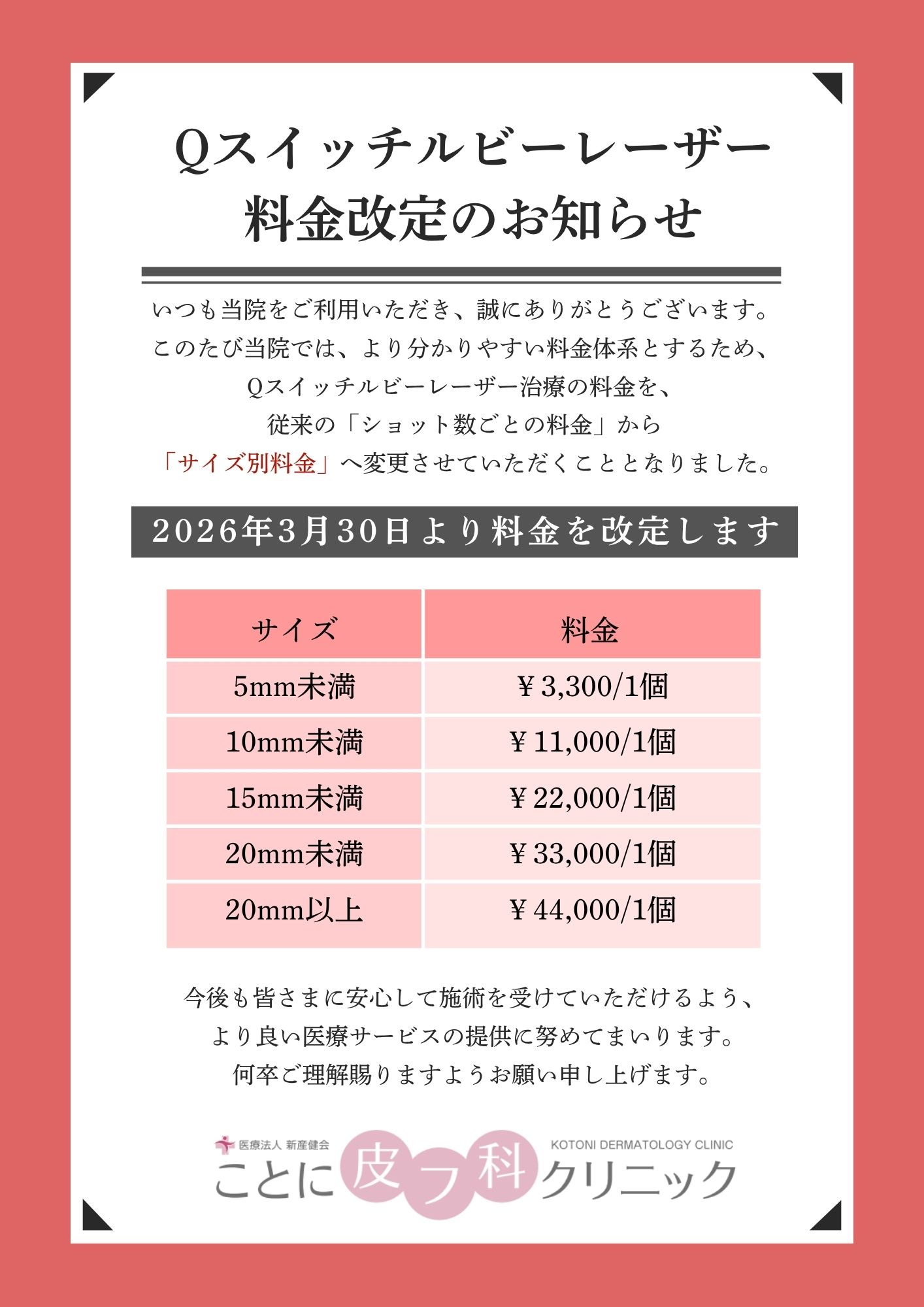 2026年3月30日より、自費施術Qスイッチルビーレーザー・CO2レーザーの価格改定を行いますので、皆様にお知らせです。