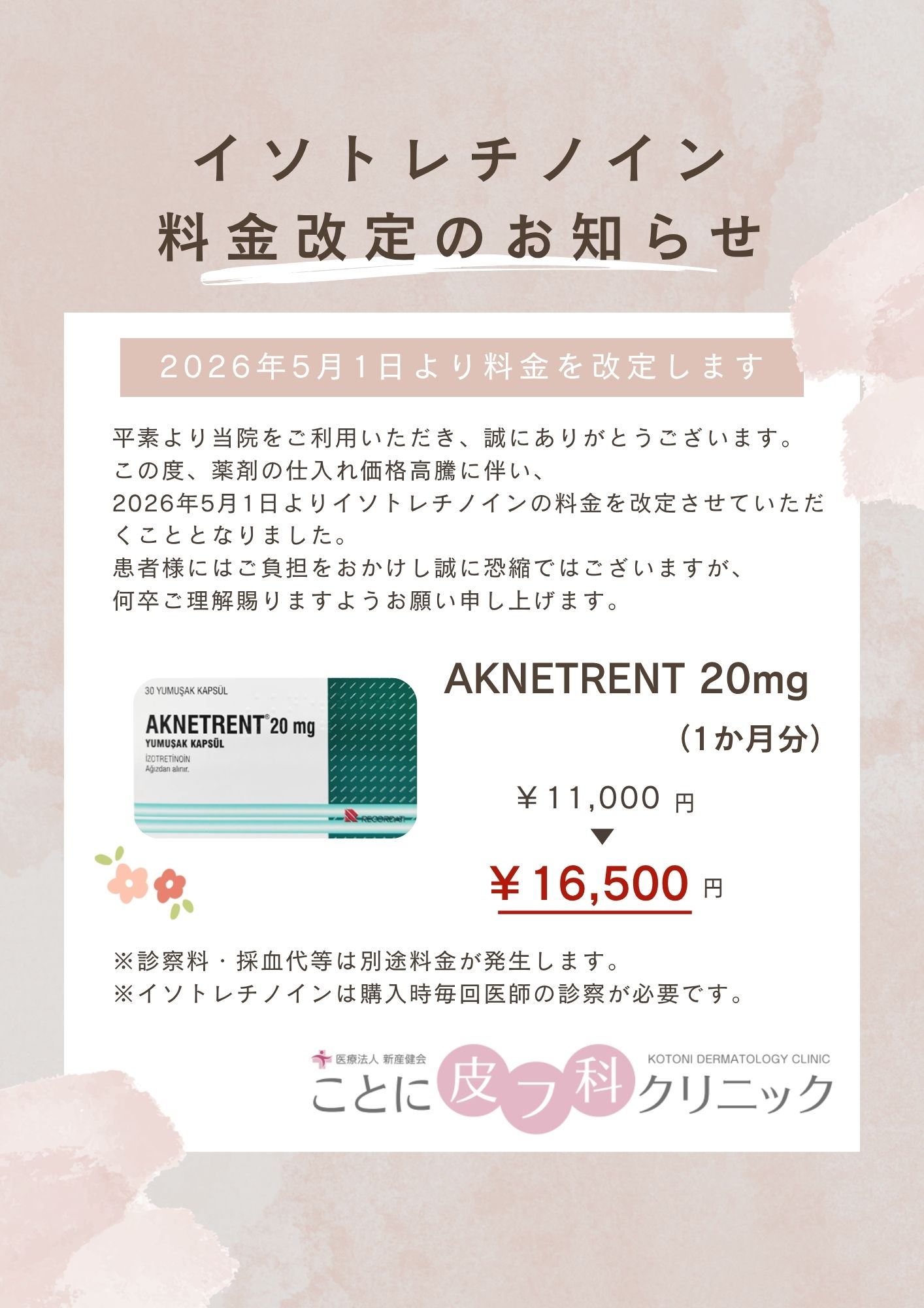 2026.03.25 お知らせ イソトレチノイン価格改定のお知らせ こんにちは、ことに皮フ科クリニックです。 2026年5月1日より、イソトレチノインの価格改定を行いますので、皆様にお知らせです。 を行いますので、皆様にお知らせです。