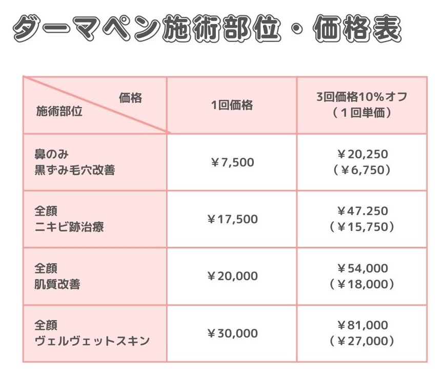 A:ケアシス、マッサージピールです。ダーマペンとマッサージピールを同日に行う場合は「ベルベットスキン」というコースです。